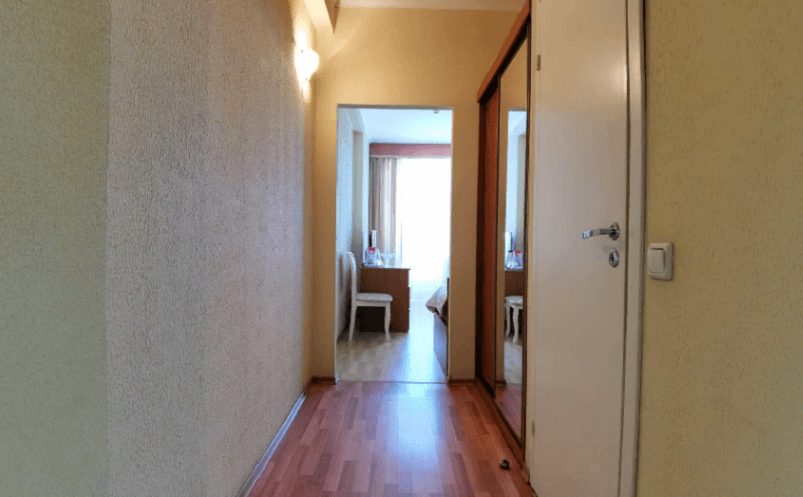 Жилая площадь составляет 10-12 квадратных метров. В спальне: кровать (90х200), кресло (раскладывается), прикроватная тумбочка, телевизор, стол, стул, холодильник, чайник, набор посуды, кондиционер, лоджия (два кресла и стол, в прихожей: шкаф-купе, вешалка.), шкаф-купе, гардеробная, платяной шкаф, гардероб, шкаф-купе. В ванной комнате: туалет, душевая кабина, раковина, зеркало, набор полотенец, умывальник, сушилка.