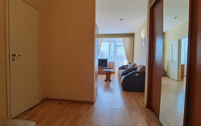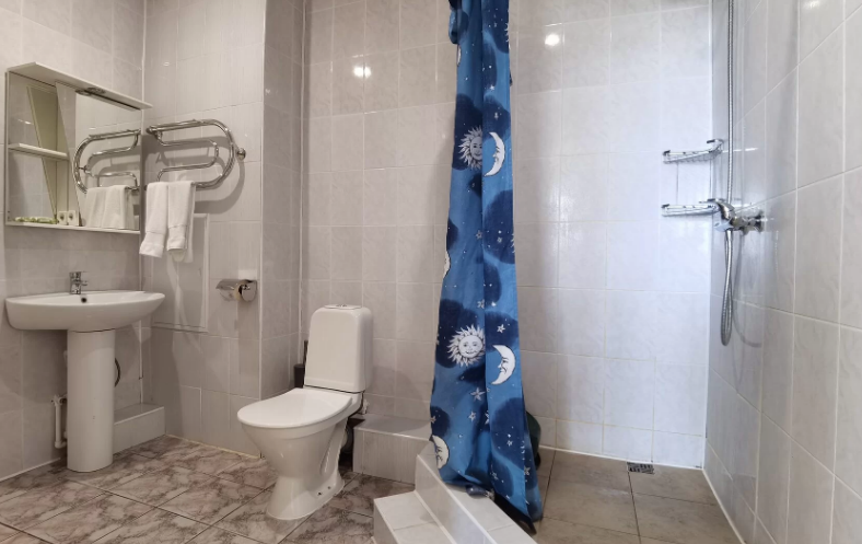 Спальня: двуспальная кровать (160 х 200), 2 прикроватные тумбочки, шкаф для одежды, телевизор, туалетный столик, стулья, зеркало, кондиционер, лоджия. Гостиная: диван (раскладной), кресло, журнальный столик, телевизор, сервант с набором посуды, чайник, выход на балкон (стол с 2 креслами). В прихожей: холодильник, вешалка, шкаф для одежды, сушилка. В ванной комнате: туалет, душевая кабина, раковина, зеркало, набор полотенец, умывальник.