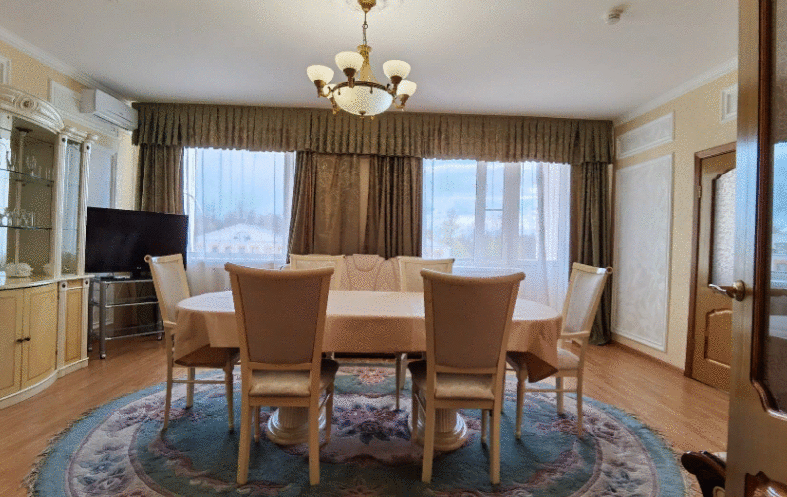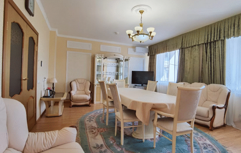 Спальня: Кровать (160 х 200), 2 прикроватные тумбочки, телевизор, туалетный столик, стулья, зеркало, кондиционер, ванная комната. Гостиная: диван (раскладной), кресло, журнальный столик, телевизор, набор посуды, чайник, обеденный стол, кондиционер, выход на балкон в прихожей и сервант: для одежды Ванная комната: Туалет, душевая кабина (или ванна), раковина, зеркало, фен, гигиенический набор, комплект полотенец, халаты, тапочки, умывальник.